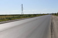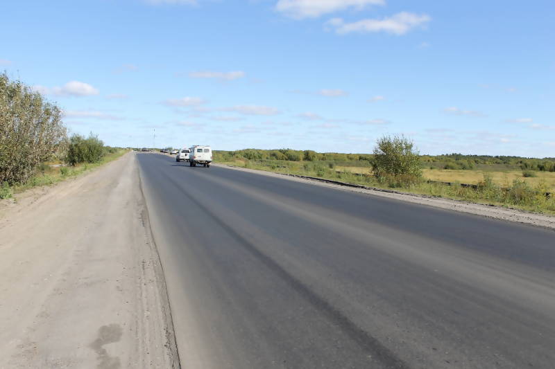 Новое покрытие уже уложено со стороны города до моста через р. Юрас. Сейчас работы ведутся на участке от аэропорта до поворота в п. Талаги.