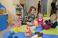Вначале гости побывали в помещении группы, где занимаются самые маленькие воспитанники детского сада. Для них сделана уютная раздевалка, оборудованное специальной мебелью и оснащенное современными игрушками игровое помещение, туалетная комната со специальной сантехникой, отдельная спальня и даже свой буфет.