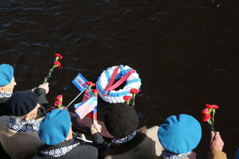 Когда пароход «Гоголь» подошел к берегу Соломбалы, между участниками митинга у закладного камня «Тем, кого не вернуло море» и ветеранами состоялся обмен приветствиями: с берега на морском семафорном языке с помощью флажков участников конвоев поздравили кадеты Архангельской школы Соловецких юнг, с судна им «ответил» Борис Давыдов – выпускник Соловецкой школы юнг 1944 года. В память о павших в морских сражениях воинах прозвучал пароходный гудок, а на воду были спущены венки и цветы.