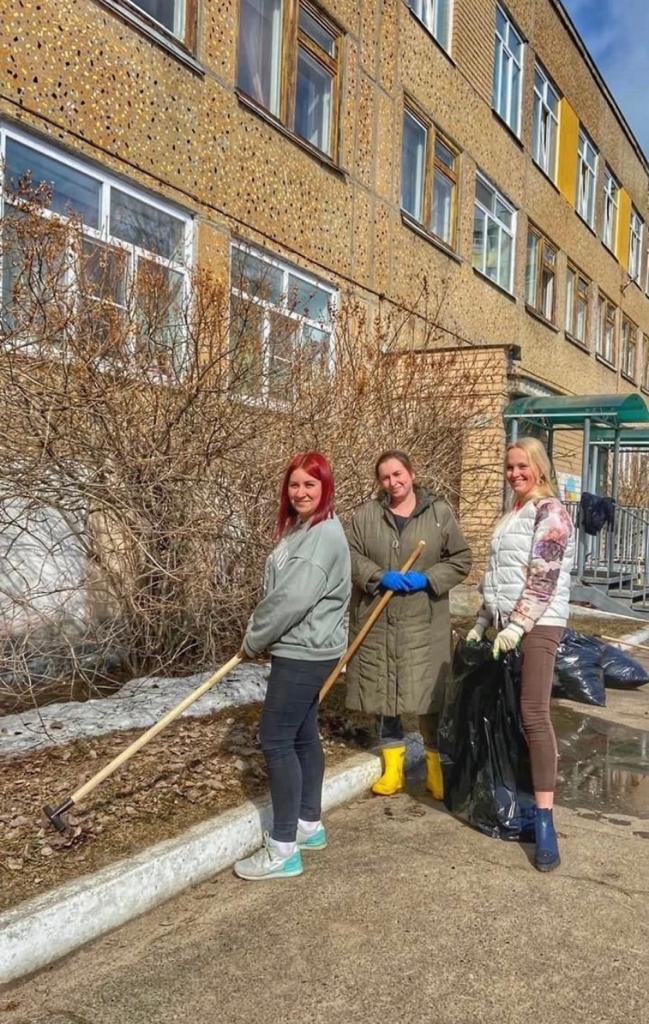 Там, где снег еще не растаял - его рыхлят для быстрого схода; там, где уже возможно - убирают листья и мусор. Уборку проводят не только на территории садиков, но и на прилегающих территориях.