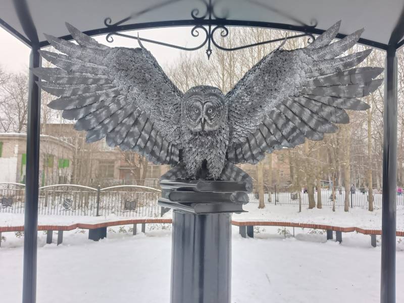 Был проведен конкурс рисунков и по эскизу победителя создали стальную фигуру совы, взлетающей с трех учебников: русского, английского и французского языков.
