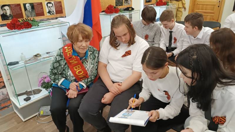 В школе №1 гостями мероприятий стали представитель народного коллектива «Хора ветеранов «Славянка» Галина Георгиевна Пушкина, чье детство прошло в суровые военные годы, и участник специальной военной операции, инструктор Центра технического творчества «Архангел» Дмитрий Рябчиков.