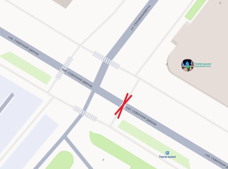 Временно закрыт один из пешеходных переходов на перекрестке наб. Северной Двины - ул. Серафимовича