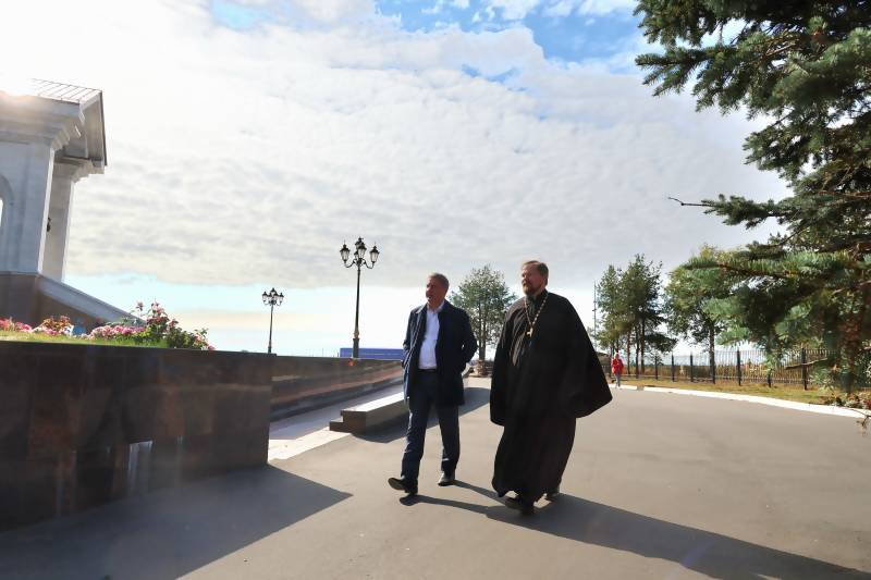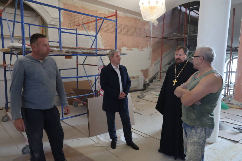 Дмитрий Морев и отец Константин обсудили благоустройство у Михаило-Архангельского кафедрального собора.