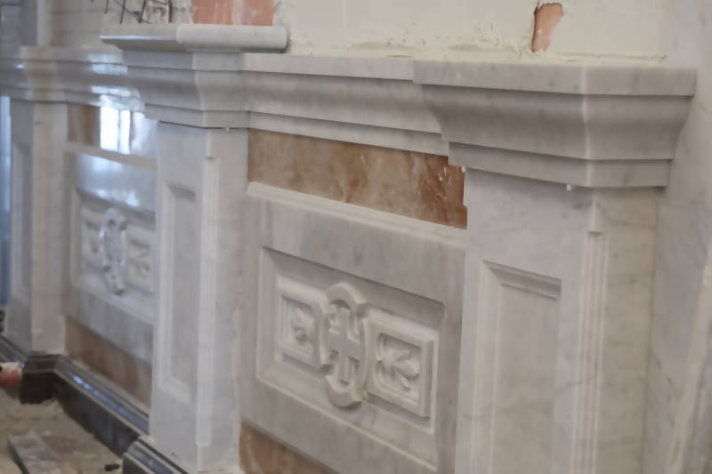 В здании собора сейчас идет оформление притвора второго этажа. Сюда ведет лестница главного входа - к верхнему храму, где проводятся службы в православные праздники. Облицовку стен камнем доверили местным мастерам. А художники готовят проект росписи потолка.