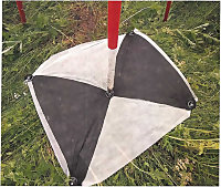 Для реализации данного вида работ на местности осуществляется маркировка планово-высотных опознавательных знаков, выполненных в виде тканевого квадрата с черными и белыми ромбами, размером 80x80 см.