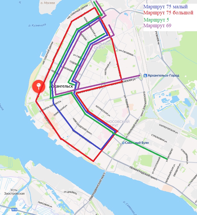 - маршрут 75Б - пр. Троицкий, ул. Гагарина, ул. Тимме (остановки "Швейная фабрика", "Тимме - Воскресенская"), ул. Воскресенская (остановки "Тимме - Воскресенская", "АГКЦ", "Площадь Дружбы народов", "Проспект Обводный канал"), пр. Обводный канал и далее по маршруту.