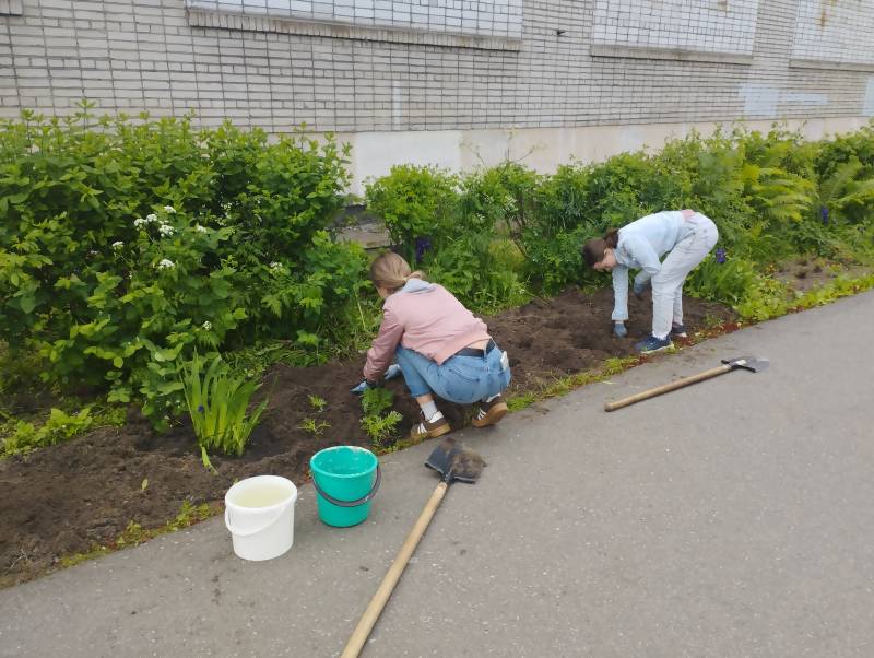 В течение июня на базе школы обучающиеся выполняют работу по озеленению школьной территории, высаживая бархатцы, уборку помещений, полив зелёного уголка, а также выполняют иные работы в соответствии с должностной инструкцией.