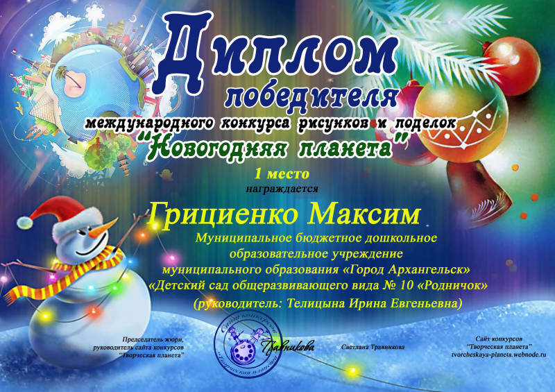 Международном конкурсе рисунков и поделок "Новогодняя планета", организаторы которого предоставили участникам возможность в состязательной форме продемонстрировать свои творческие способности. Дети принимали участие в двух номинациях: живопись и декоративно-прикладное творчество. На конкурс были представлены рисунки, а также поделки новогодних красавиц – елочек, снеговика и композиции на новогоднюю тематику. Воспитанник старшей группы Грициенко Максим занял 1 место в международном конкурсе рисунков и поделок "Новогодняя планета", воспитанник второй младшей группы Герман Егор – 2 место. Работы воспитанников Горло Миланы, Малыгина Ивана отмечены дипломами лауреатов конкурса.