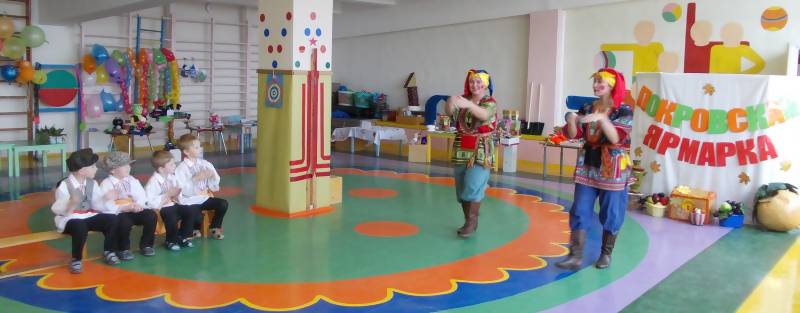 Цель: познакомить детей с историей возникновения народного праздника; национальными традициями, бытом и обычаями русского народа; русским песенным фольклором. В детском саду Покров Пресвятой Богородицы любят и отмечают с размахом каждый год. Веселье было широкое и задорное. Фольклорная группа педагогов и воспитанников "Сударушка" исполняла народные песни о картошке, баранках и самоваре. Детский оркестр русских народных инструментов играл "Яренскую лирическую". Скоморохи – Фома и Ерёма заводили гостей шутками, прибаутками и загадками. Девиз праздника - Давайте веселиться, петь, плясать, и не лениться!
