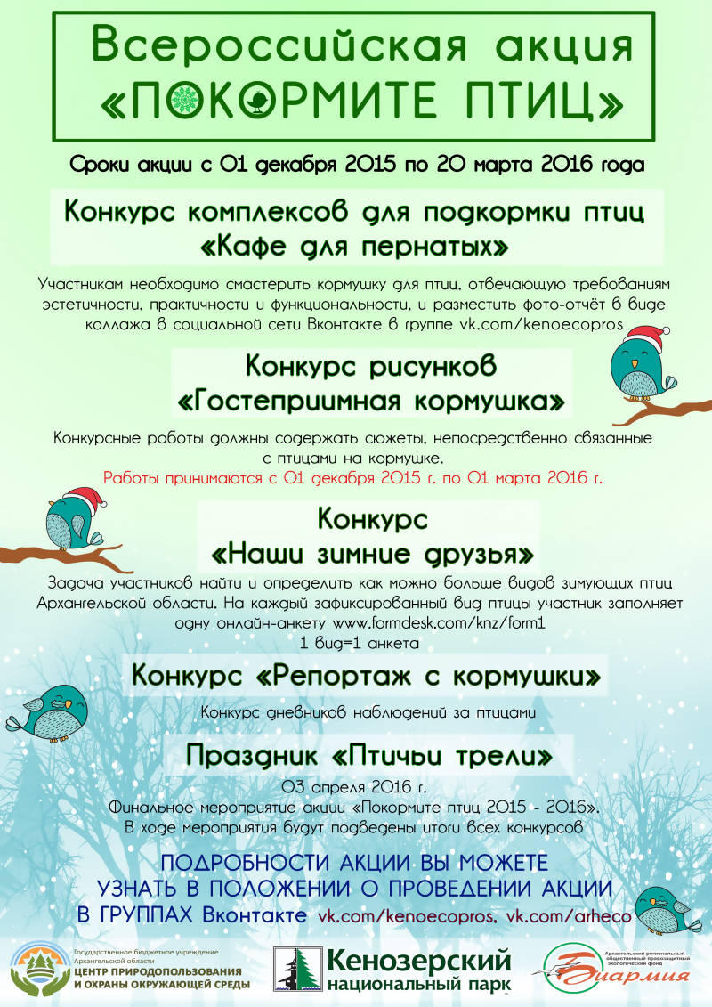 Федеральное государственное бюджетное учреждение "Национальный парк "Кенозерский" совместно с ГБУ Архангельской области "Центр по охране окружающей среды", Архангельским региональным общественным правозащитным экологическим фондом "Биармия" в рамках областного этапа Всероссийской эколого-культурной акции "Покормите птиц 2015-2016" организует проведение конкурсов для учащихся и воспитанников образовательных учреждений города Архангельска и области: конкурс комплексов для подкормки птиц "Кафе для пернатых", конкурс детских рисунков "Гостеприимная кормушка", конкурс дневников наблюдений "Репортаж с кормушки", конкурс юных бердвотчеров "Наши зимние друзья".