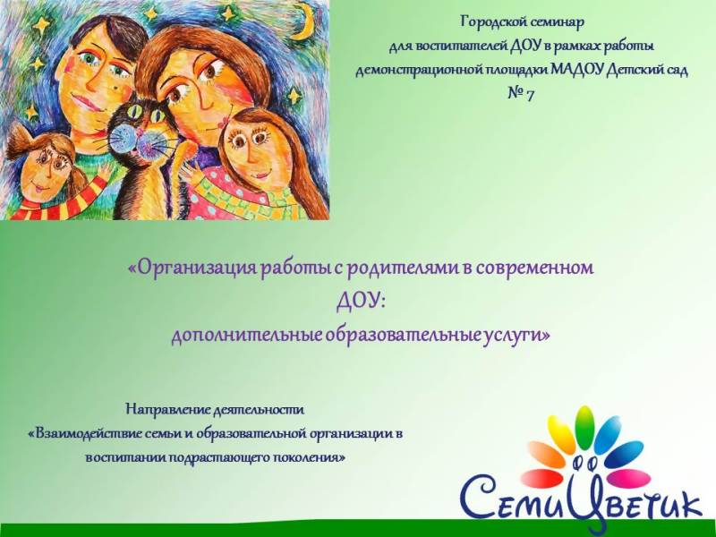 Детский сад № 7 в рамках работы демонстрационной площадки по направлению "Взаимодействие семьи и образовательной организации в воспитании подрастающего поколения" провел городской семинар, организованный для воспитателей и специалистов ДОУ по теме: "Организация работы с родителями в современном ДОУ: дополнительные образовательные услуги".