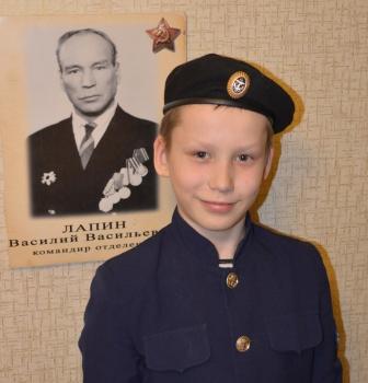 В сочинении, которое в полном объёме можно прочитать в газете “АРХАНГЕЛЬСК – ГОРОД ВОИНСКОЙ СЛАВЫ” (№ 29, 2016 г.), он рассказал об участии прадеда в перегоне тральщиков из Сент-Питерсберга (США) в Полярный; об участии ТЩ-116 в проводке конвоев и тралении фарватеров; о потоплении подводной лодки. За вклад в дело Победы Лапин Василий Васильевич был награждён медалью Ушакова и медалями “За боевые заслуги”, “За оборону Советского Заполярья”, “За победу над Германией в Великой Отечественной войне 1941-1945 гг.” и Орденом Отечественной войны II степени.
