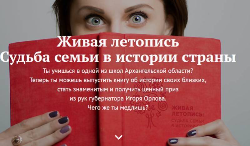 Архангельская область оказалась первым российским регионом, который организовал у себя необычную просветительскую акцию: «Живая летопись. Судьба семьи в истории страны». Ученикам 6–11 классов предлагают выступить в роли исследователей и стать авторами собственных книг.На конкурс принимаются работы школьников Поморья, которые рассказывают об истории собственных семей, а значит, и об истории родного края. Объём текста одного произведения может достигать 35 тысяч знаков, включая пробелы. Авторами могут стать и творческие коллективы.