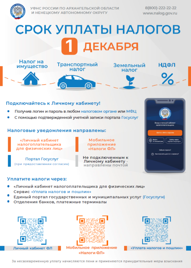 Управление Федеральной налоговой службы России по Архангельской области и Ненецкому автономному округу напоминает, что срок уплаты гражданами имущественных налогов и налога на доходы физических лиц (НДФЛ), неудержанного налоговым агентом, за 2024 год не позднее 1 декабря 2025 года.