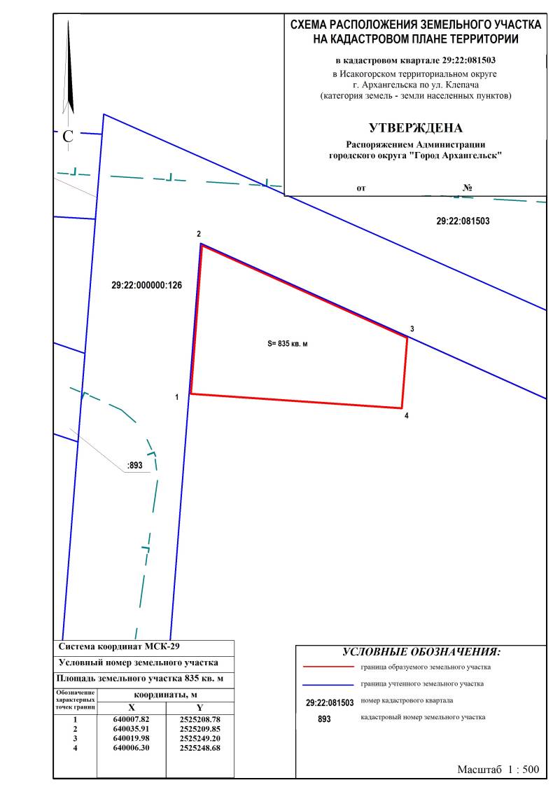 Извещение о предоставлении земельного участка для индивидуального жилищного строительства, расположенного в Исакогорском территориальном округе г. Архангельска по ул. Клепача площадью 835 кв. м