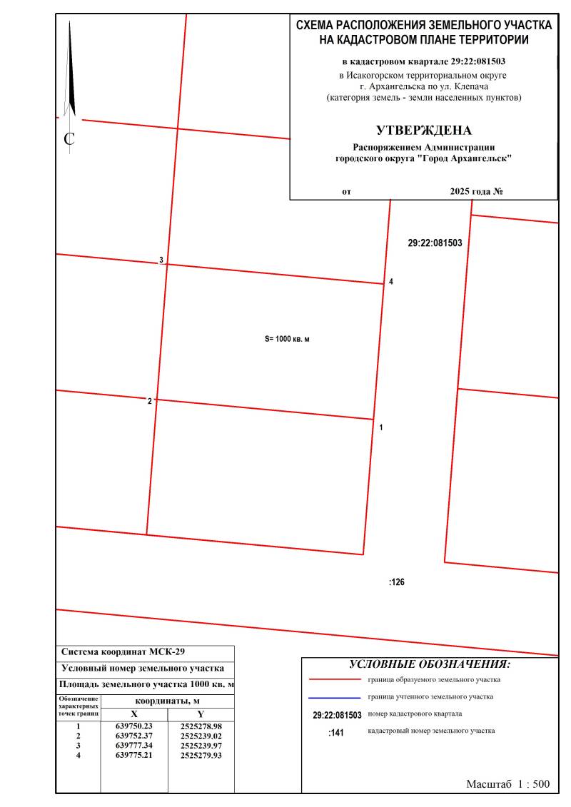 Извещение о предоставлении земельного участка для индивидуального жилищного строительства, расположенного в Исакогорском территориальном округе г. Архангельска по ул. Клепача, площадью 1000 кв. м