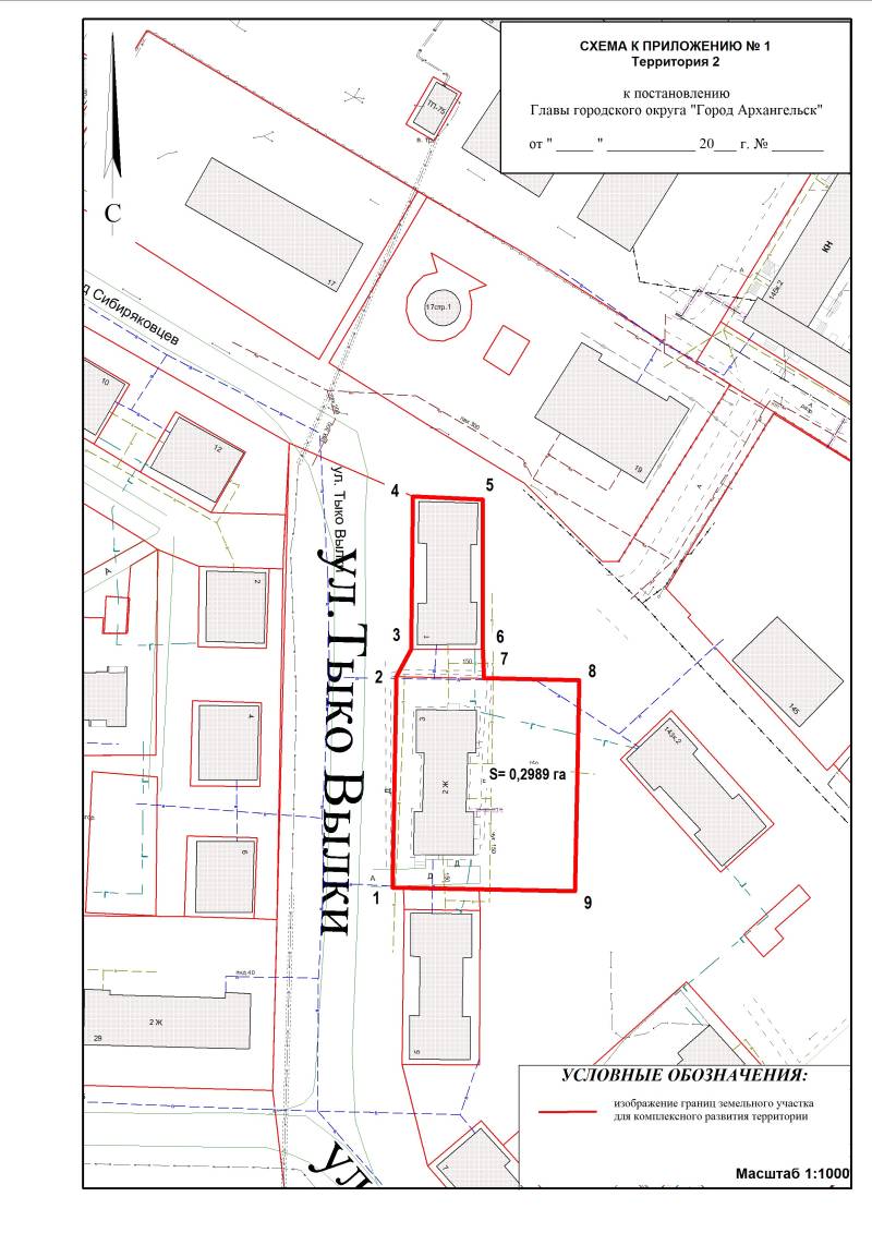 Комплексное развитие территории жилой застройки городского округа "Город Архангельск" в отношении двух несмежных территорий, в границах которых предусматривается осуществление деятельности по комплексному развитию территории, с заключением одного договора о комплексном развитии таких территорий: в границах части элемента планировочной структуры: просп. Ломоносова, ул. Урицкого, наб. Северной Двины, ул. Северодвинская площадью 2,2080 га (Территория 1); в границах части элемента планировочной структуры: просп. Обводный канал, ул. Гагарина, ул. Самойло площадью 0,2989 га (Территория 2)
