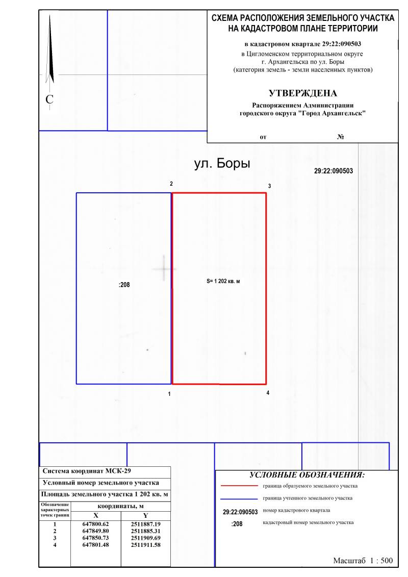 "Город Архангельск" извещает о возможности предоставления земельного участка, расположенного в Цигломенском территориальном округе г. Архангельска по ул. Боры площадью 1 202 кв. м, для индивидуального жилищного строительства согласно представленной схеме расположения земельного участка.