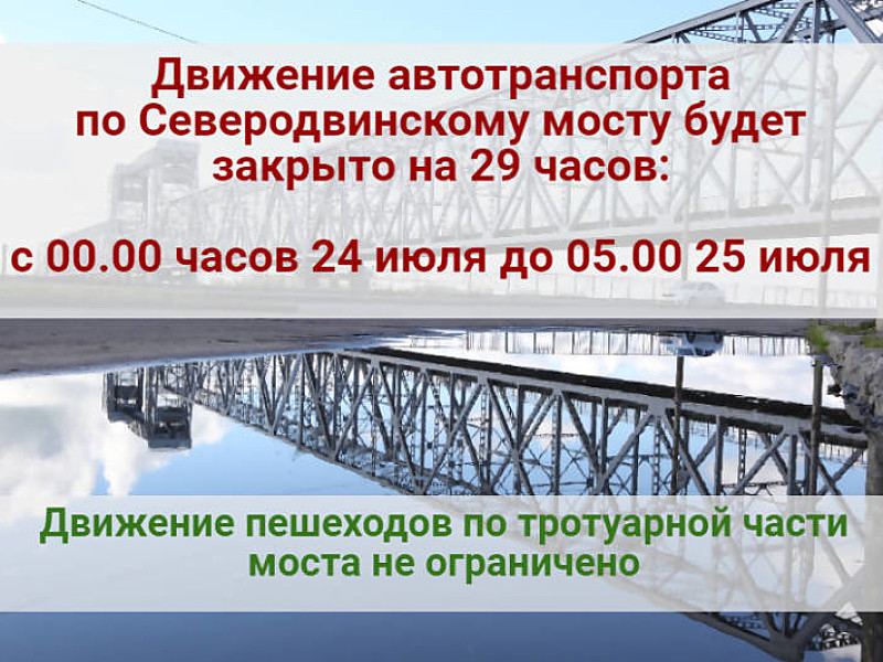 С 00.00 часов 24 июля до 05.00 25 июля автомобильное движение по мосту закрывается для завершения мероприятия по устройству деформационных швов. «Окно» перекрытия составит 29 часов.