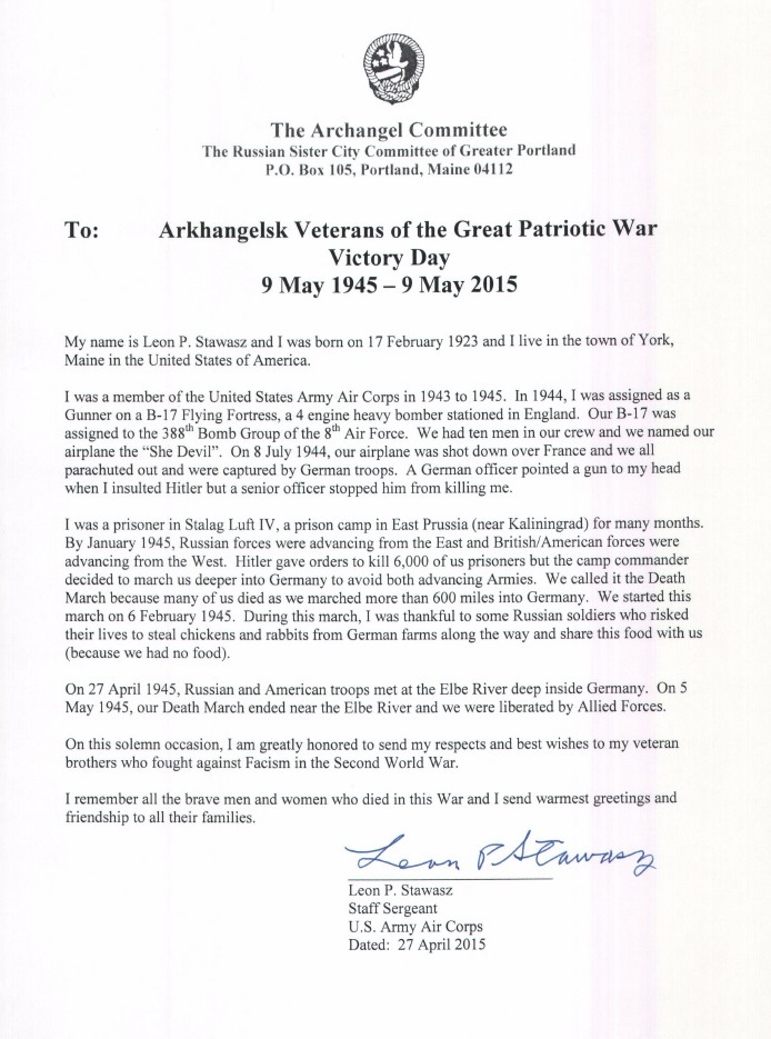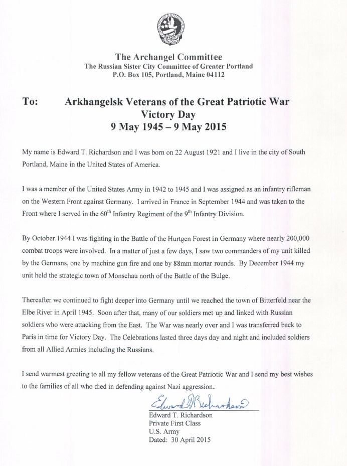 Сегодня ветераны из США поздравляют своих боевых товарищей из Архангельска и разделяют с ними радость великого и славного Дня Победы.