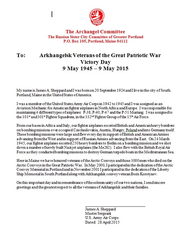 Мы в Портленде гордимся ветеранами Северных конвоев, живущими в штате Мэн, и помним 3000 моряков, которые погибли в Арктике, в годы Великой Отечественной войны. В мае 2000 года я участвовал в торжественном открытии мемориала, посвященного Северным конвоям, в Портленде, а в 2001 году участвовал в торжественном открытии мемориала, посвященного кораблям типа «Либерти» в Южном Портленде вместе с ветераном из Архангельска Борисом Коротаевым. В этот важный день и в память о единении наших народов примите мои искреннее приветствия и огромное уважение всем ветеранам Архангельска и их семьям.