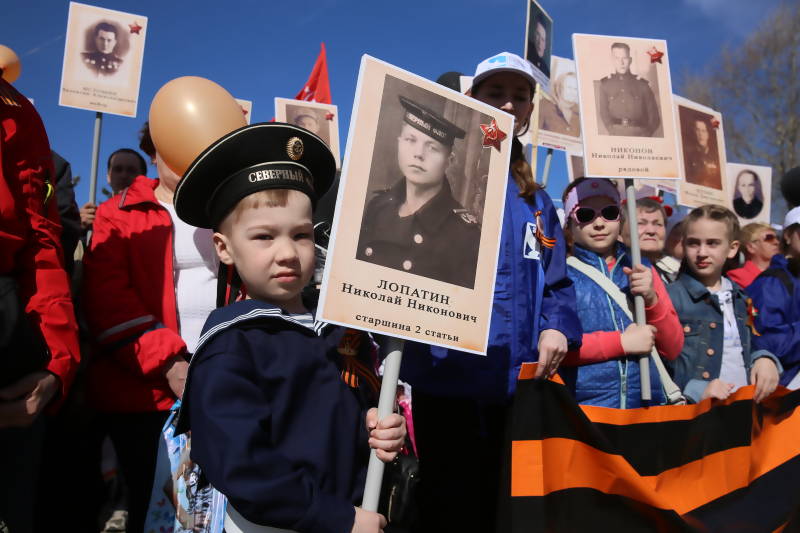 Четно-белые фотографии украшены георгиевскими лентами. Многие из людей, запечатленных на снимках, никогда не принимали участие в победных парадах, не вернувшись живыми с полей сражений. Некоторые так и остались в памяти родных рядом с сухими строчками официальной записи - «пропал без вести». Но сегодня все они - в общем строю «Бессмертного полка», как и миллионы других людей, фотографии которых пронесут по улицам более 600 населенных пунктах - России, Украины, Белоруссии, Казахстана, Кыргызстана, Монголии, Израиля, Эстонии, Норвегии, США.
