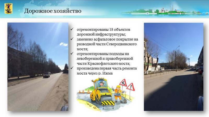 - за счет средств, предусмотренных на содержание мостов и путепроводов, заменено асфальтовое покрытие на разводной части Северодвинского моста, отремонтированы подходы на левобережной и правобережной части Краснофлотского моста, произведена первая часть ремонта моста через р. Ижма.