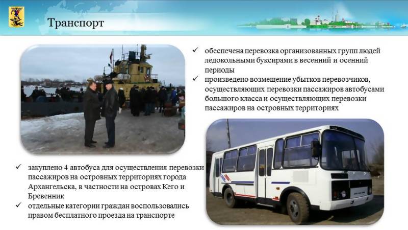 Еще одна статья расходов на общественный транспорт связана с обеспечением транспортной доступности островных территорий в период ледостава и ледохода. В городском бюджете на эти цели выделяется 64,5 млн. руб. Эти средства идут на компенсацию стоимости перевозки организованных групп граждан по пяти линиям на буксирах ледового класса, которая осуществляется бесплатно. В год буксирами перевозится до 170 тыс. человек или более 5 тыс. горожан в сутки.