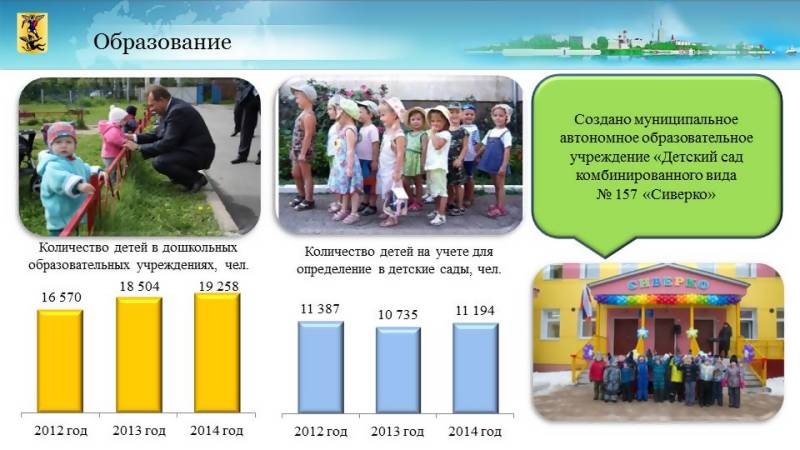 В 2014 году за счёт эффективного использования помещений в детсадах дополнительно открыто 9 групп на 175 мест. Кроме того после реконструкции открыт новый детсад № 157 «Сиверко» на 219 мест на ул. Полины Осипенко,7, к.2.