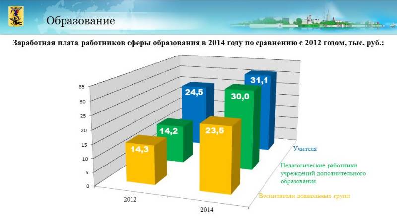 Рост заработной платы в 2014 году в сравнении с 2012 составил: воспитатели дошкольных групп на 164,3%, учителя – 126,9%, педагогические работники учреждений дополнительного образования детей – 211,2%.