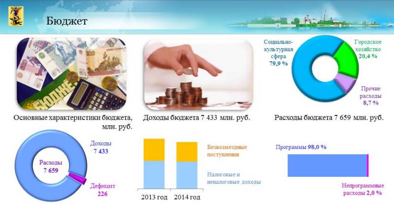 Городской бюджет за 2014 год исполнен по доходам в сумме 7,4 млрд. рублей, по расходам - в сумме 7,6 млрд. рублей, с дефицитом в размере 226,7 млн. рублей.