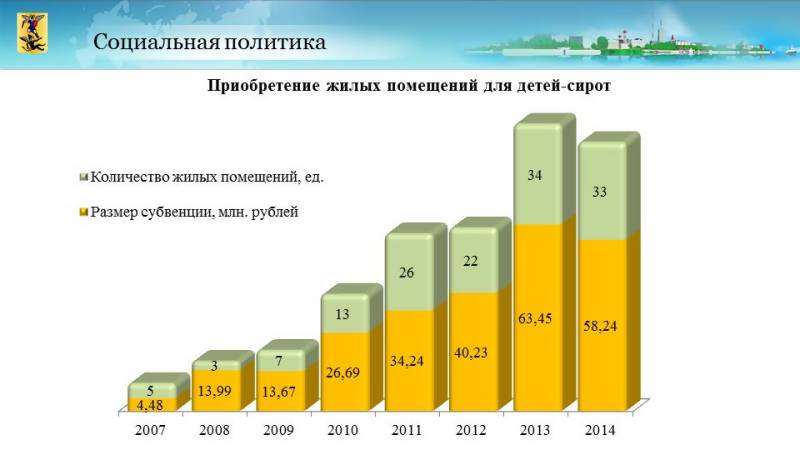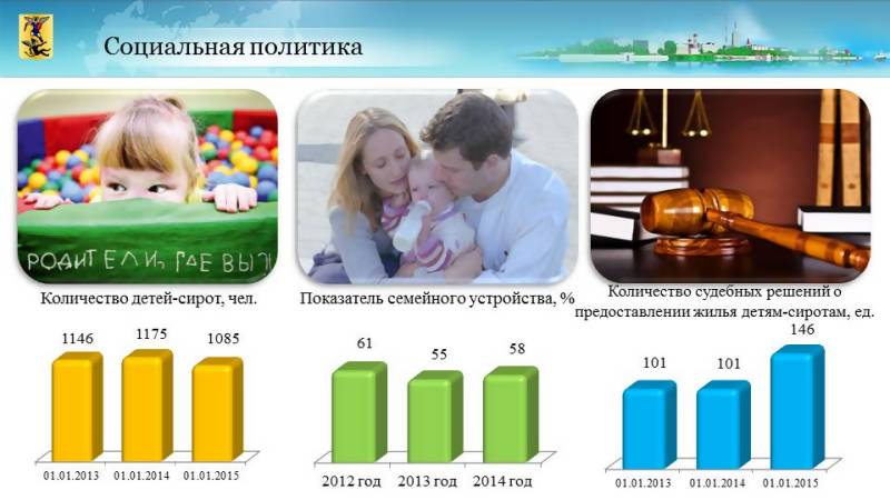 Мэрия продолжает исполнять полномочия, переданные областным правительством по покупке жилья для детей-сирот. В 2014 году нами за счет средств областного бюджета приобретены 33 жилых помещения для 34 детей-сирот, а также за счет средств городского бюджета отремонтированы 5 жилых помещений, закрепленных за детьми-сиротами.