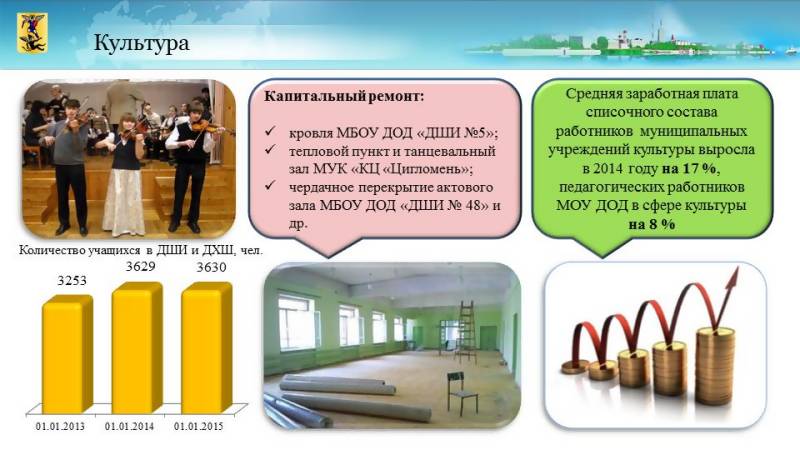 Кроме того, в 2014 году за счет средств городского бюджета выполнены работы по капитальному ремонту: кровли Детской школы искусств №5 и чердачного перекрытия актового зала Детской школы искусств №48; теплового пункта и танцевального зала КЦ «Цигломень».