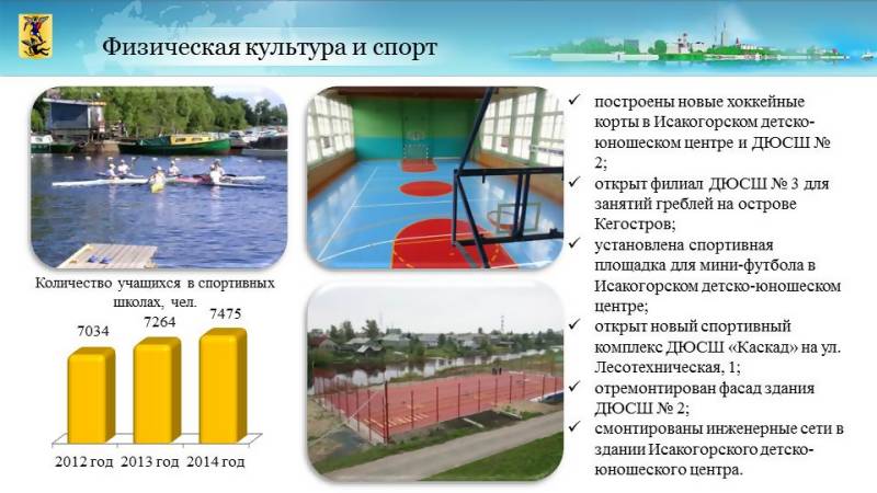 В 2014 году построены новые хоккейные корты в Исакогорском детско-юношеском центре и ДЮСШ № 2; открыт филиал ДЮСШ № 3 для занятий греблей на острове Кегостров; открыт новый спортивный комплекс ДЮСШ «Каскад» на ул. Лесотехническая, 1; отремонтирован фасад здания ДЮСШ № 2; для ДЮСШ № 5 выделены дополнительные помещения для занятий площадью 313 кв. м. В учреждения приобретено около 300 единиц спортивного инвентаря и оборудования.
