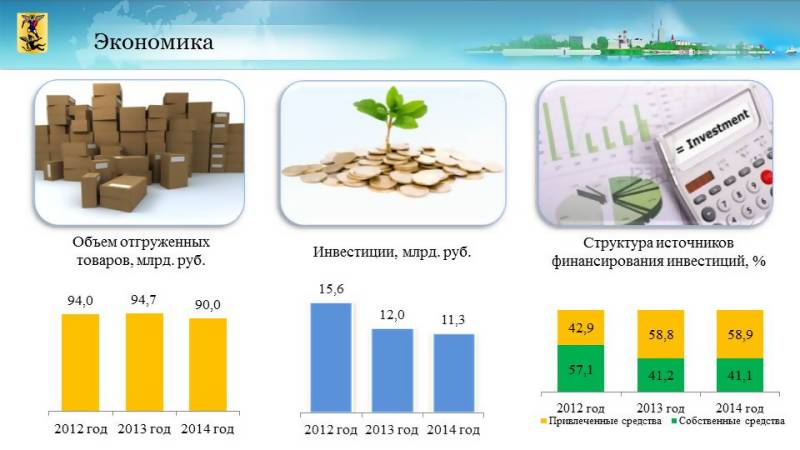 Несколько слов о показателях экономического развития Архангельска. Объем отгруженных товаров собственного производства, выполненных работ и услуг организациями всех видов экономической деятельности за 2014 год составил 90 млрд. рублей. Отмечен рост в таких отраслях как обрабатывающая промышленность, рыболовство, транспорт и связь.