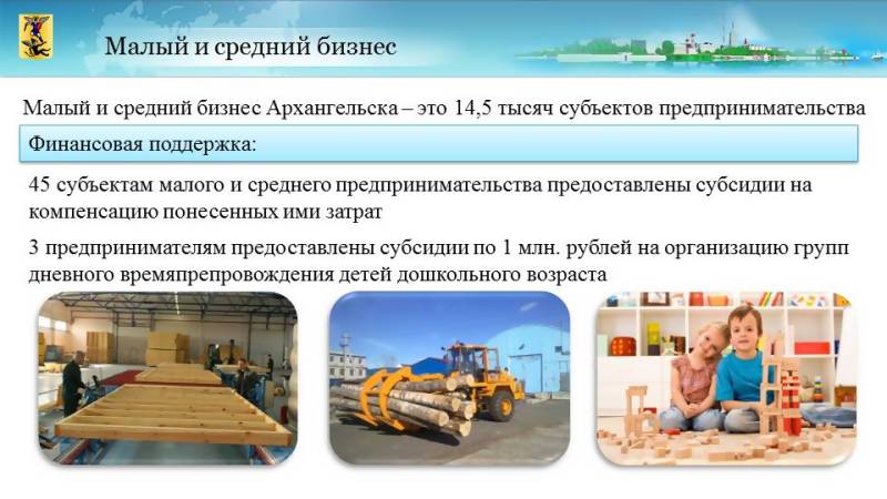 Перед муниципалитетом стояла задача осуществления планомерной системной, стратегической работы по созданию условий, способствующих устойчивому функционированию экономики Архангельска. Это, прежде всего формирование благоприятного инвестиционного климата, поддержка малого и среднего бизнеса, предпринимательской инициативы.
