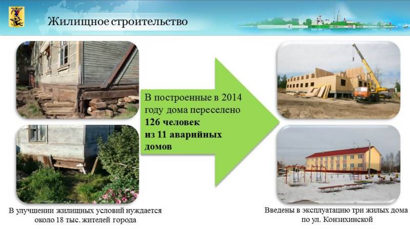 Для расселения горожан из непригодного для проживания жилья в 2014 году построено и введено в эксплуатацию три 12-ти квартирных жилых дома (36 квартир) по ул. Конзихинской в Северном территориальном округе. В них переселено 126 человек из 11 аварийных домов.