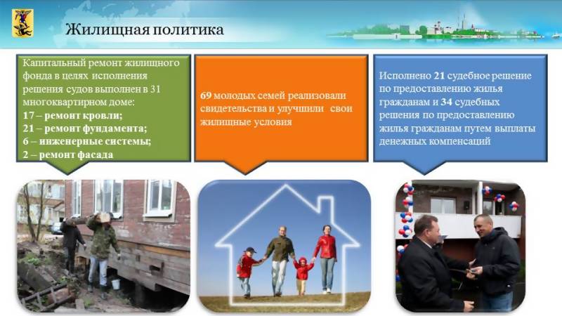 С 2014 года по федеральному законодательству обязанность организации проведения капремонта в многоквартирных домах возложена на власти региона. Для этого правительством Архангельской области создан региональный оператор по капремонту жилья. По примерным подсчетам общее начисление взносов на капремонт по Архангельску в год должно составить не менее 400 млн. рублей. Кроме того в городском бюджете предусмотрено 120 млн. рублей на оплату взносов на капремонт муниципальной доли жилфонда. Однако в прошлом году ремонт фактически не проводился, так как первые счета собственникам были выставлены только в ноябре. В областную программу попали 3,8 тыс. жилых домов Архангельска. Но в 75% из них согласно перечню, утвержденному правительством области, капитальные ремонты будут производиться в 2038-2043 годах. Поэтому в прошлом году нам удалось изыскать 102 млн. рублей на капитальный ремонт жилищного фонда в целях исполнения решения судов. Работы выполнены в 31 доме, в том числе произведен ремонт кровли (17 домов), фундамента (21 дом), инженерных систем (6 домов), ремонт фасада (2 дома).