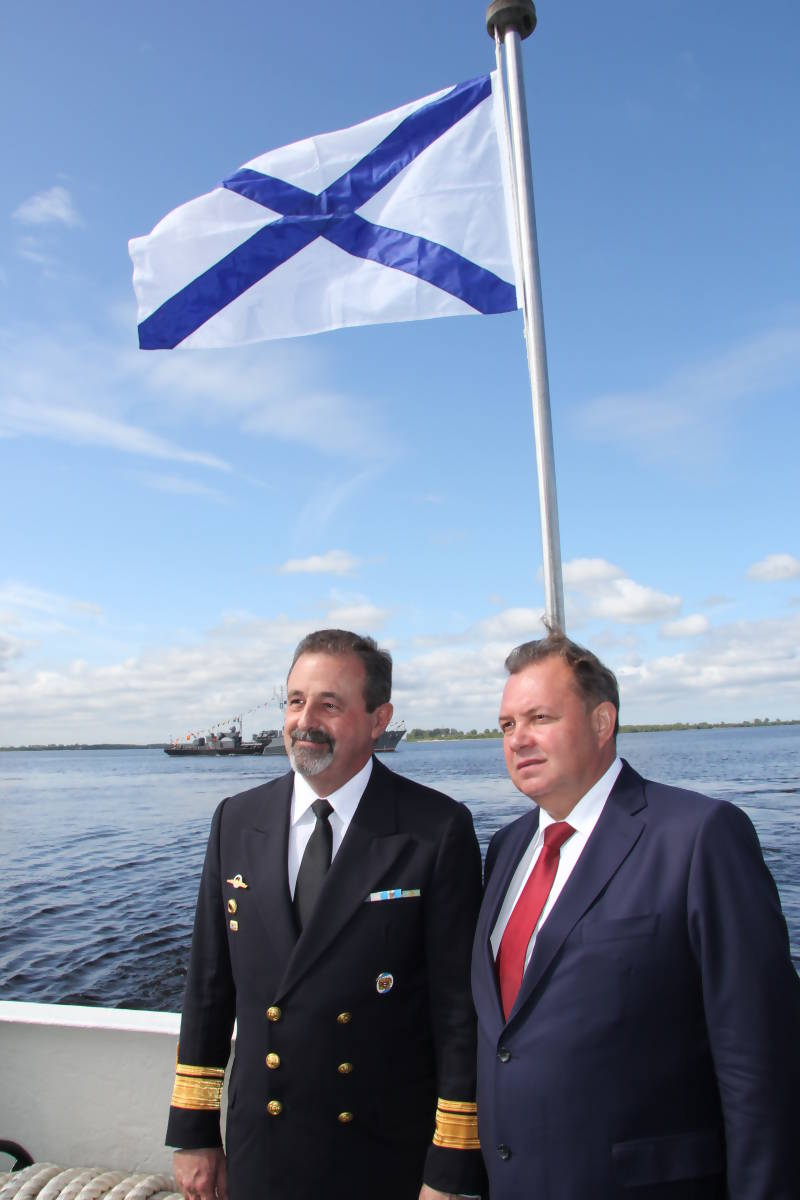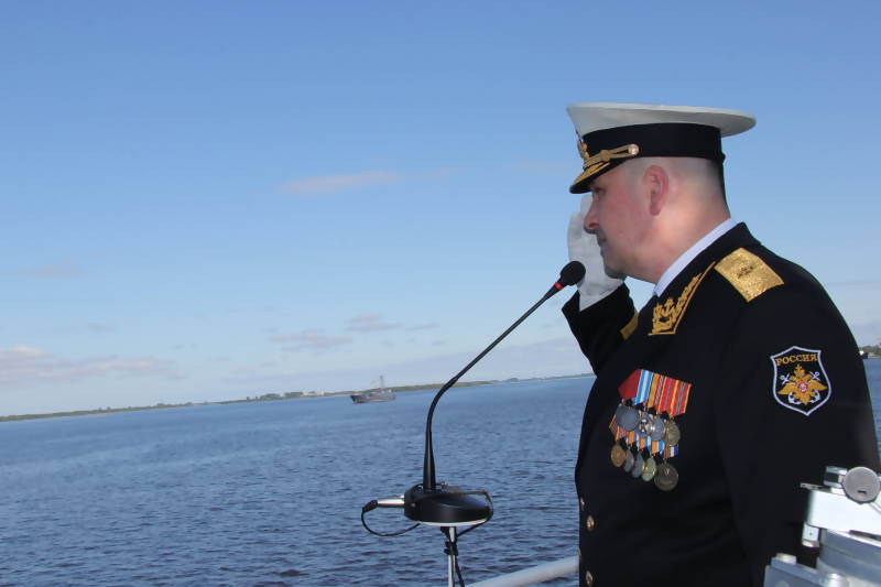 По традиции при прохождении «Беломорца» вдоль строя кораблей принимающий парад контр-адмирал Владимир Воробьев приветствовал выстроенные на верхней палубе экипажи. Над Северной Двиной неоднократно звучало флотское «Ура».