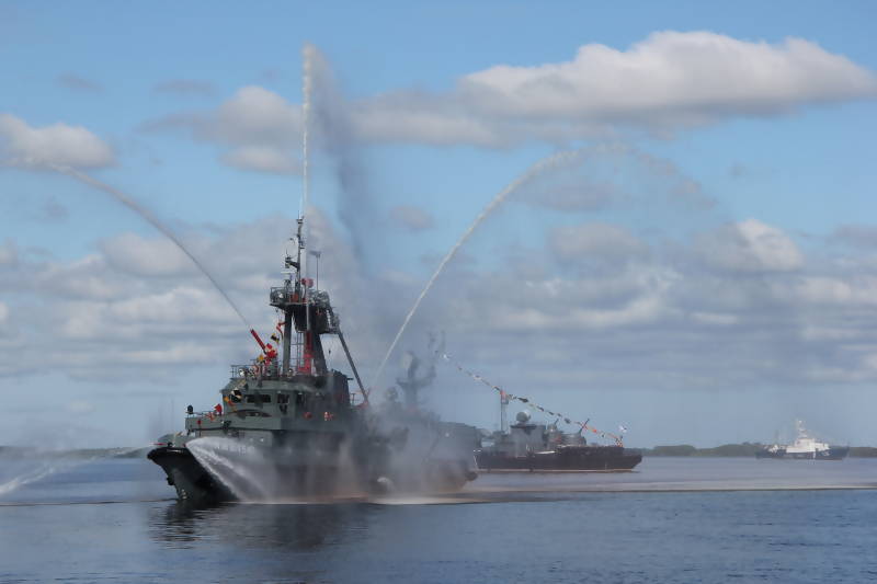В параде приняли участие малые противолодочные корабли «Онега» и «Нарьян-Мар», военный транспорт ВТР-140, а также сторожевой корабль «Кизляр» Пограничного управления ФСБ по Архангельской области.