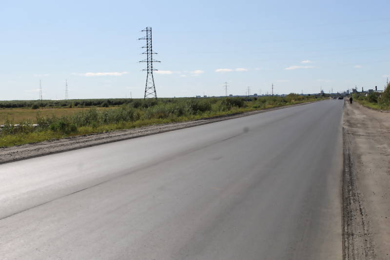 Новое покрытие уже уложено со стороны города до моста через р. Юрас. Сейчас работы ведутся на участке от аэропорта до поворота в п. Талаги.