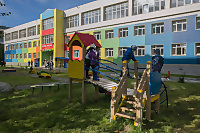 Территория вокруг детского сада тоже оборудована для активных игр на свежем воздухе: к услугам юных горожан яркие веранды для каждой группы, различные малые архитектурные формы, игровые комплексы.