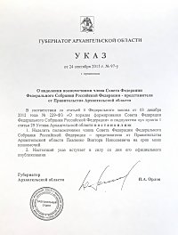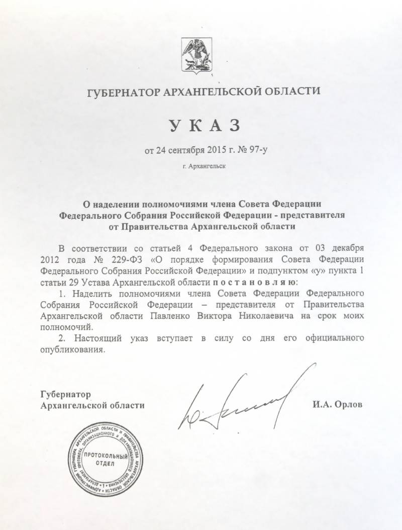 «В соответствии со статьей 4 Федерального закона от 3 декабря 2012 года №229-ФЗ «О порядке формирования Совета Федерации Федерального Собрания Российской Федерации» и подпунктом «у» пункта 1 статьи 29 Устава Архангельской области постановляю: Наделить полномочиями члена Совета Федерации Федерального Собрания Российской Федерации – представителя от Правительства Архангельской области Павленко Виктора Николаевича на срок моих полномочий. Настоящий Указ вступает в силу со дня его официального опубликования».