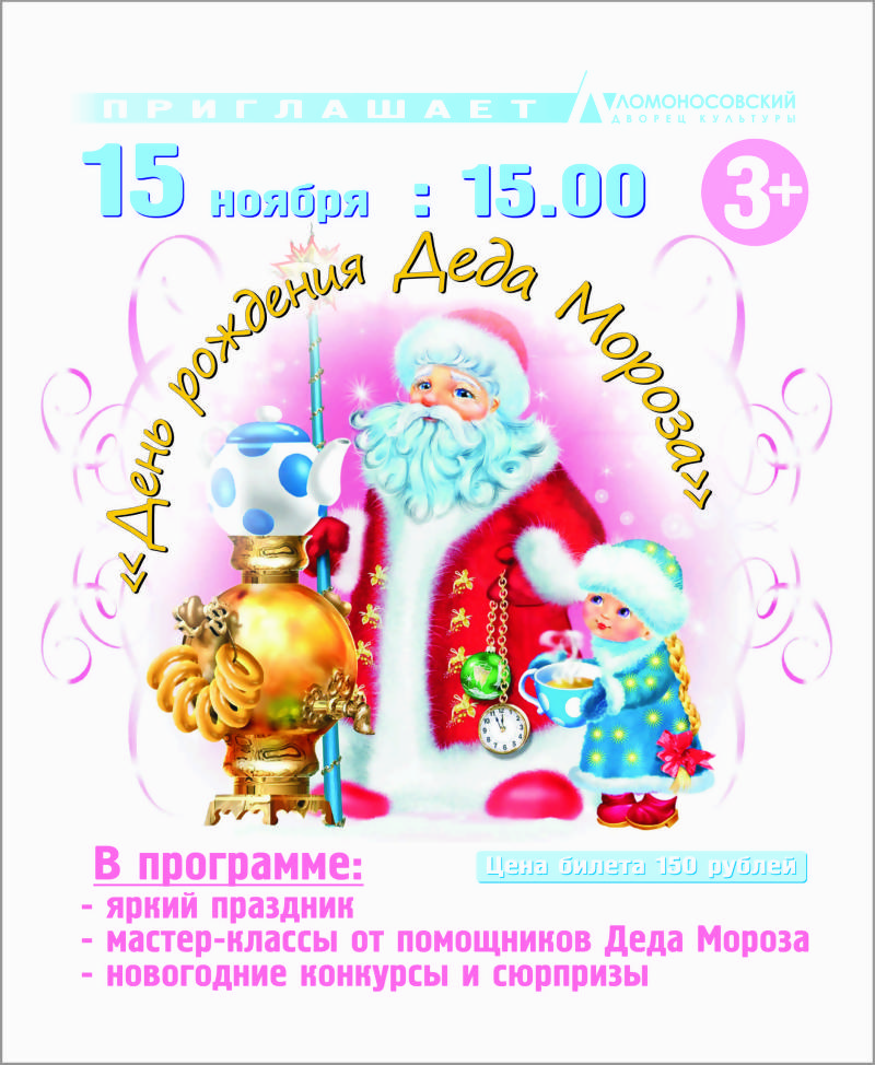В Ломоносовском Дворце культуры 15 ноября в 15.00 часов Дед Мороз приглашает гостей на празднование своего Дня рождения.
