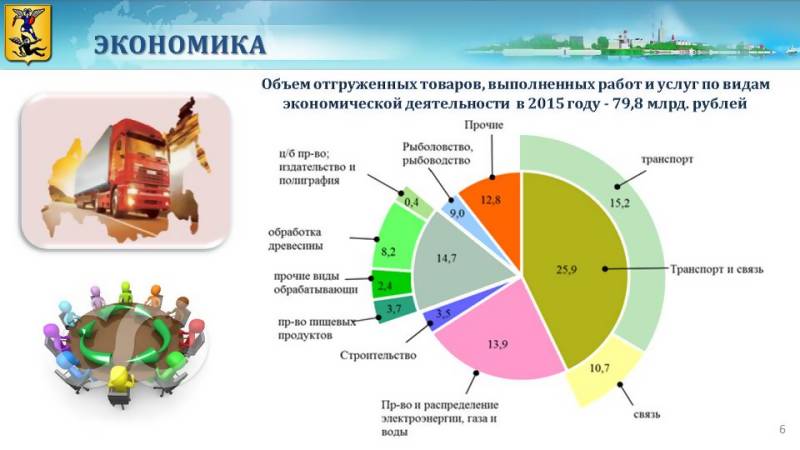 Объем отгруженных товаров собственного производства, выполненных работ и услуг организациями всех видов экономической деятельности за 2015 год составил почти 80 млрд. рублей или 109,5% к уровню 2014 года. Отмечен рост в таких отраслях как обрабатывающие производства, транспорт и связь, рыболовство.