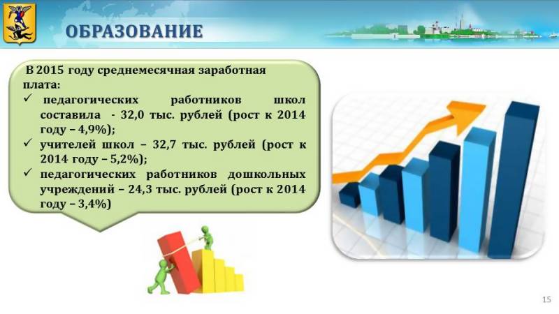 Он отметил, что не смотря на сложный городской бюджет, оплата труда работников образования продолжает увеличиваться. Кроме того, в 2015 году за счет средств муниципалитета для отдельных категорий работников образования производились специальные выплаты (работники учреждений допобразования, повара и подсобные рабочие дошкольных учреждений, молодые специалисты, лучшие учителя).