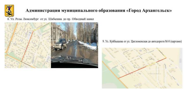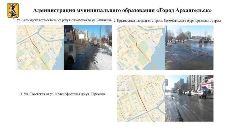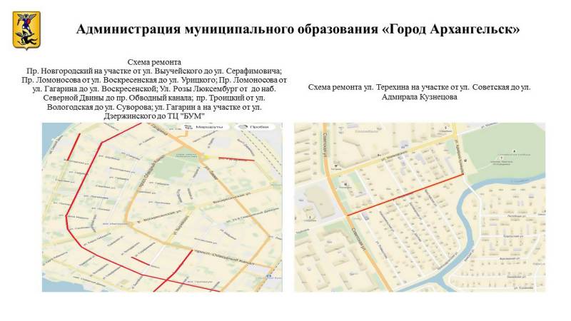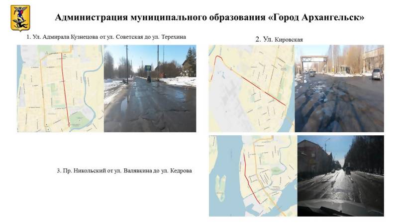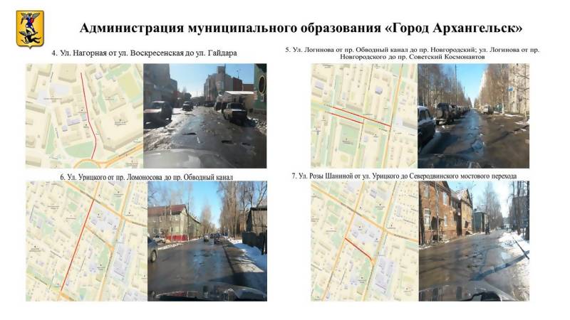 Первый этап реализации мероприятий по ремонту будет осуществляться в рамках муниципальных контрактов на содержание автомобильных дорог общего пользования, заключенных в 2016 году с МУП «Архкомхоз» и ЗАО «АГСУМ» и ООО «РСК «Малахит». Работы будут производиться на объектах в Соломбальском, Октябрьском и Ломоносовском округах. Всего планируется отремонтировать 32,5 тыс. м2 (или 3,8 км) покрытия по следующим участкам: ул. Таймырская от моста через реку Соломбалка до ул. Валявкина; Предмостная площадь со стороны Соломбальского территориального округа; ул. Советская от ул. Краснофлотская до ул. Терехина; ул. Нагорная от ул. Воскресенская до ул. Гайдара; ул. Логинова от пр. Обводный канал до пр. Новгородский; ул. Логинова от пр. Новгородского до пр. Советский Космонавтов; ул. Урицкого от пр. Ломоносова до пр. Обводный канал; ул. Розы Шаниной от ул. Урицкого до Северодвинского мостового перехода; ул. Розы Люксембург от ул. Шабалина до пр. Обводный канал и 11,6 тыс. м2 покрытия ямочным ремонтом (в прошлом году – 13 тыс. м2).