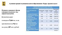 Всего на территории Архангельска имеется 550 км муниципальных дорог, в том числе улиц I и II категории с асфальтобетонным покрытием – 220 км, площадью 1 млн. 760 тыс. м.кв.