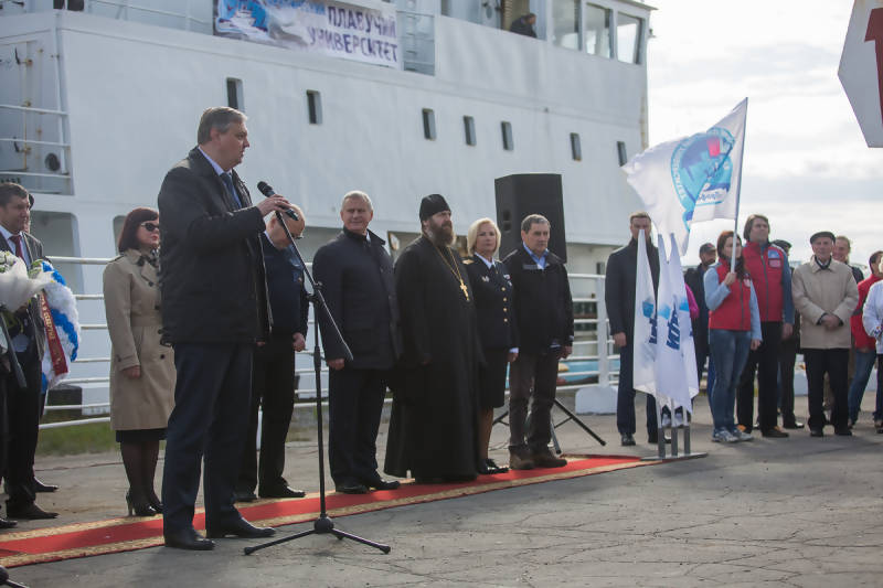 - Архангельск гордится, что именно от нашего причала Арктический плавучий университет отходит в очередной рейс, и мы надеемся, что из экспедиции студенты, ученые вернутся с новыми исследованиями, которые